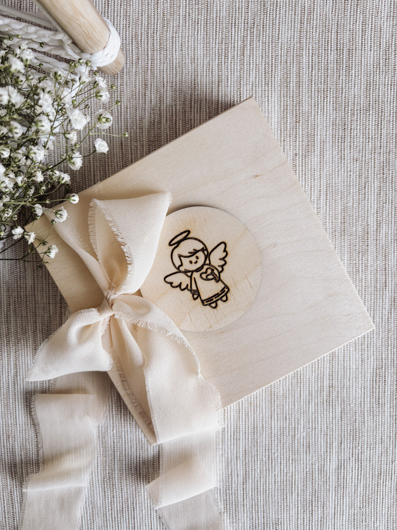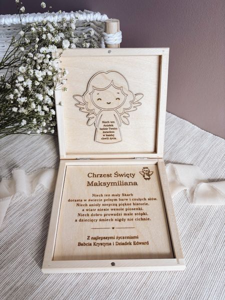 Drewniane pudełko na Chrzest Święty z aniołkiem