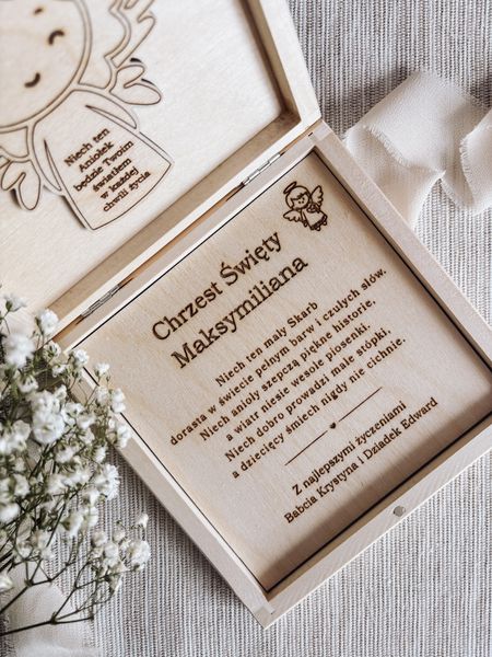 Podaruj bliskiej osobie coś więcej niż upominek — podaruj piękne wspomnienie. Nasze personalizowane pudełko na Chrzest Święty z uroczym motywem aniołka i wyjątkową dedykacją to niepowtarzalna pamiątka na całe życie. Wykonane z naturalnego drewna sosnowego, zachwyca prostotą i elegancją.