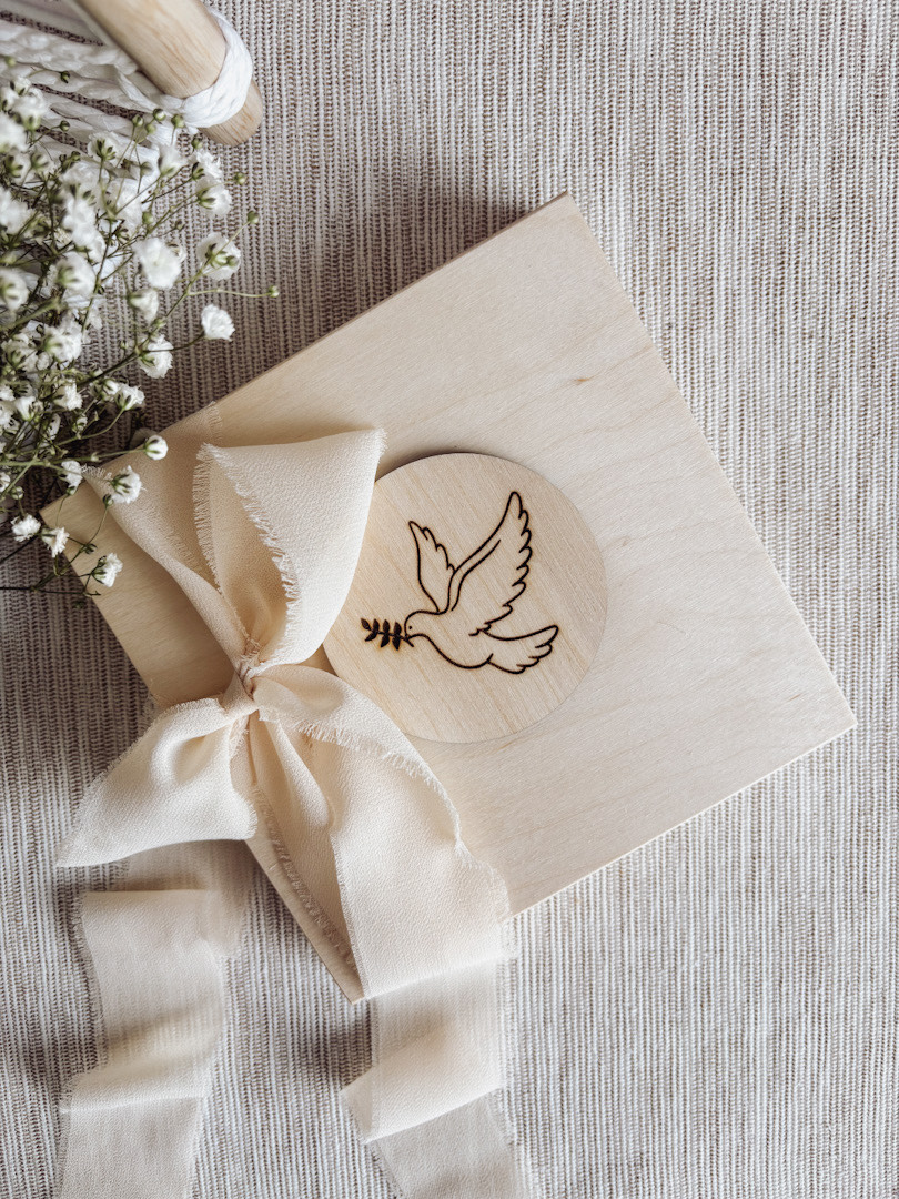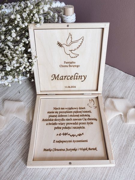 Podaruj wyjątkową pamiątkę, która zostanie z dzieckiem na całe życie. Nasze drewniane pudełko z delikatnym motywem gołąbka — symbolizującego czystość i pokój — to nie tylko elegancki prezent, ale również wyraz ciepłych życzeń i duchowego wsparcia.
