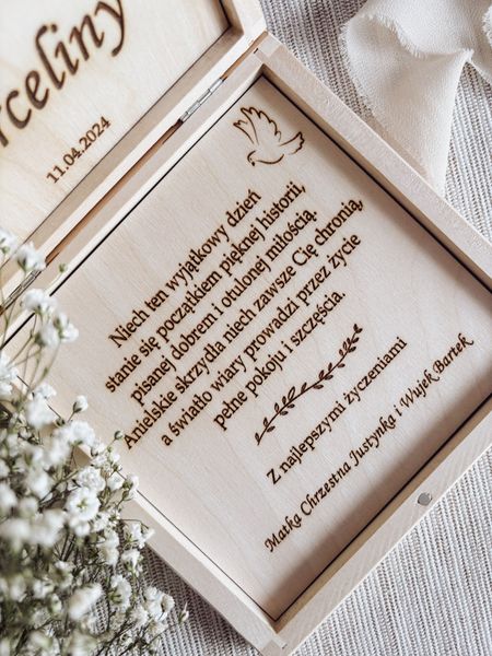 Personalizacja: imię dziecka, data uroczystości oraz dedykacja wygrawerowana wewnątrz pudełka