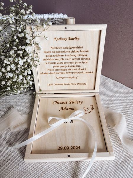 Personalizacja: imię dziecka, data uroczystości oraz dedykacja wygrawerowana wewnątrz pudełka