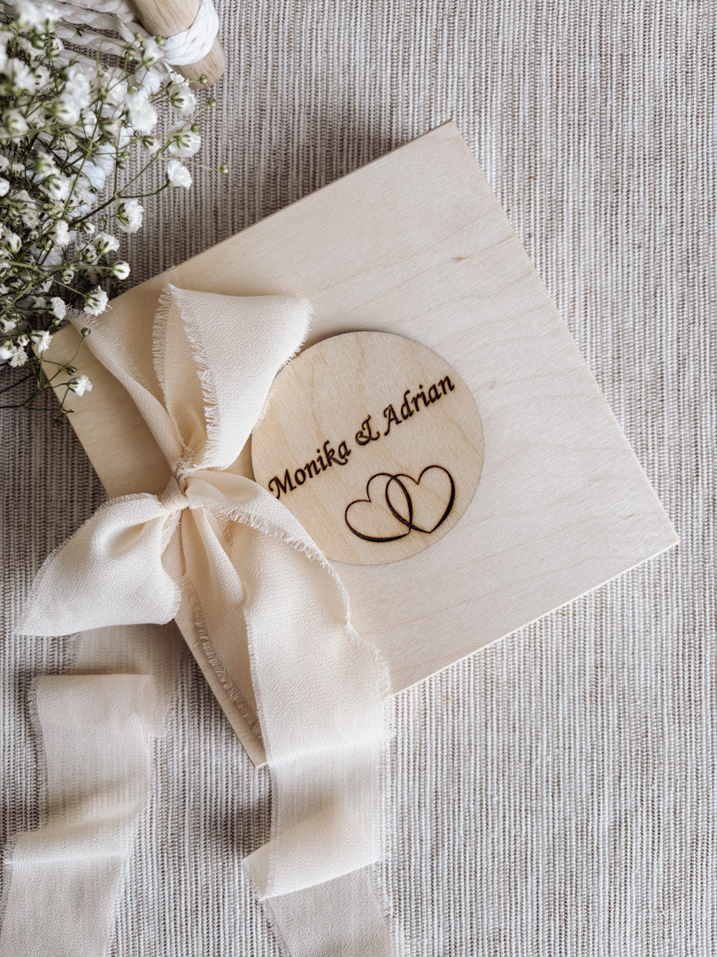 Prezent ślubny, który mówi więcej niż słowa. Naturalne drewno i delikatne detale. Personalizacja nadaje mu osobisty i wyjątkowy charakter.