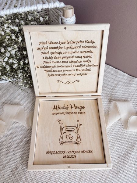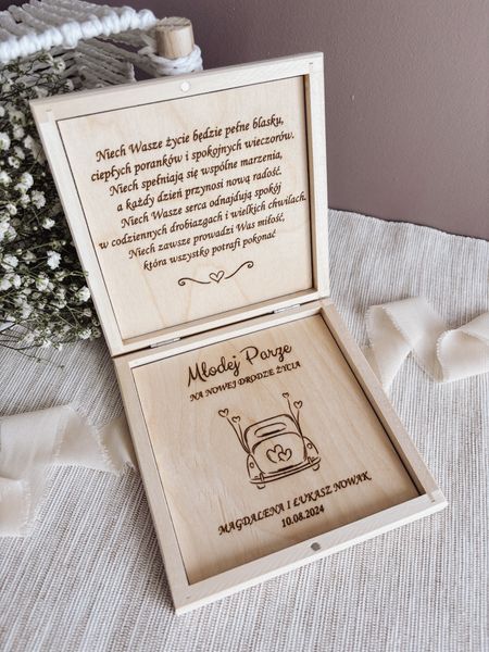 Wyjątkowe pudełko ślubne wykonane z naturalnego drewna, ozdobione delikatnym grawerem przedstawiającym samochód nowożeńców. To nie tylko elegancki dodatek do prezentu, ale również piękna pamiątka, która zostanie z Młodą Parą na długie lata.