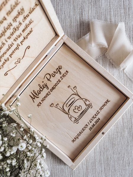 Personalizacja: imiona Nowożeńców wygrawerowane na wieczku pudełka, dedykacja oraz data uroczystości wygrawerowana wewnątrz pudełka