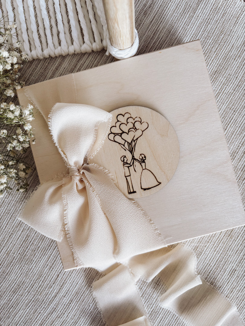 Drewniane pudełko ślubne z motywem zakochanych z balonami
