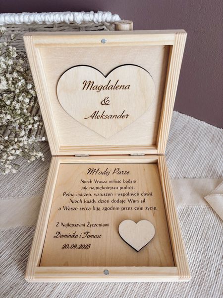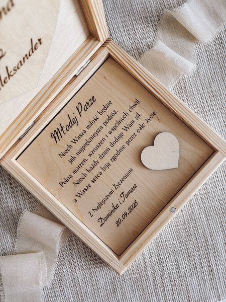 Szukasz prezentu ślubnego, który będzie wzruszający oraz niezapomniany? To personalizowane pudełko wykonane z naturalnego drewna, zdobione romantycznym motywem Młodej Pary i grawerowanymi życzeniami, to idealny wybór.